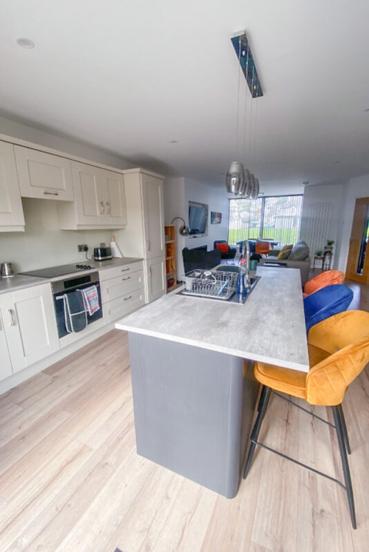 - Open plan kitchen, living dining area with a table to seat 6